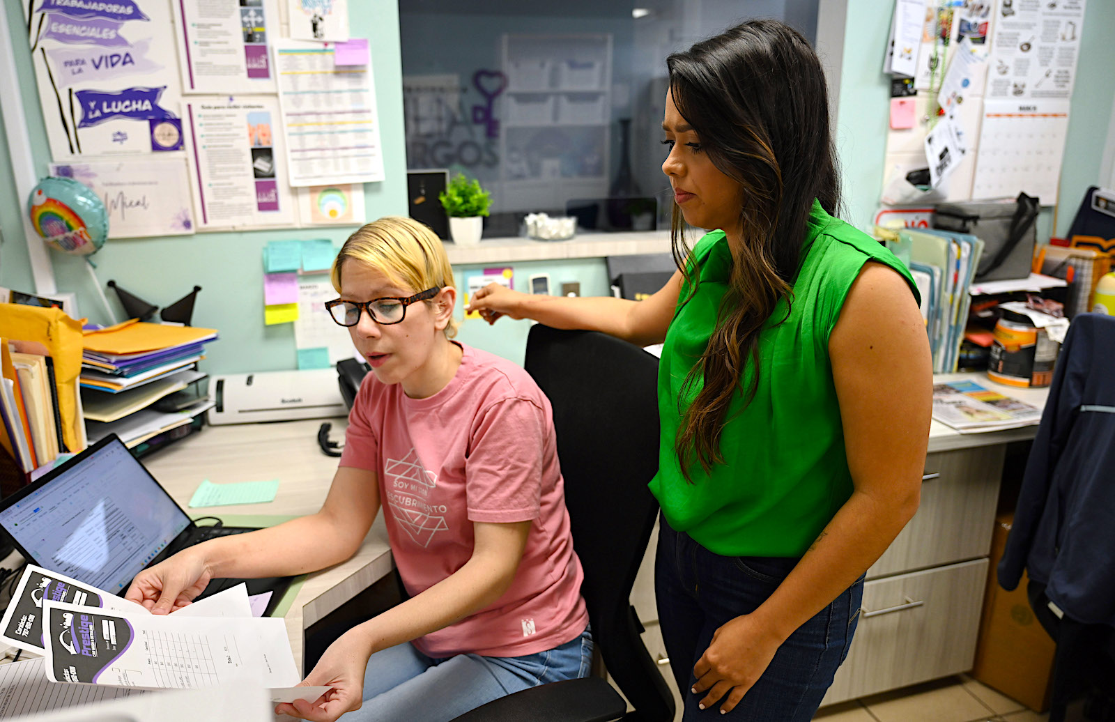 La directora ejecutiva de la Casa Protegida Julia de Burgos, Lenna Ramírez Cintrón, evalúa información de contabilidad con la facilitadora administrativa Mical Crespo Álvarez. (Foto: Ana María Abruña Reyes/Todas/todaspr.com)