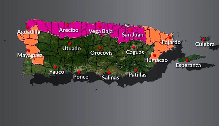 El aviso incluye los pueblos de Bayamón, Carolina, Catano, Guaynabo, San Juan, Toa Alta, Toa Baja, Trujillo Alto, Arecibo, Barceloneta, Dorado, Florida, Manatí, Vega Alta, Vega Baja, Aguadilla, Camuy, Hatillo, Isabela, and Quebradillas.