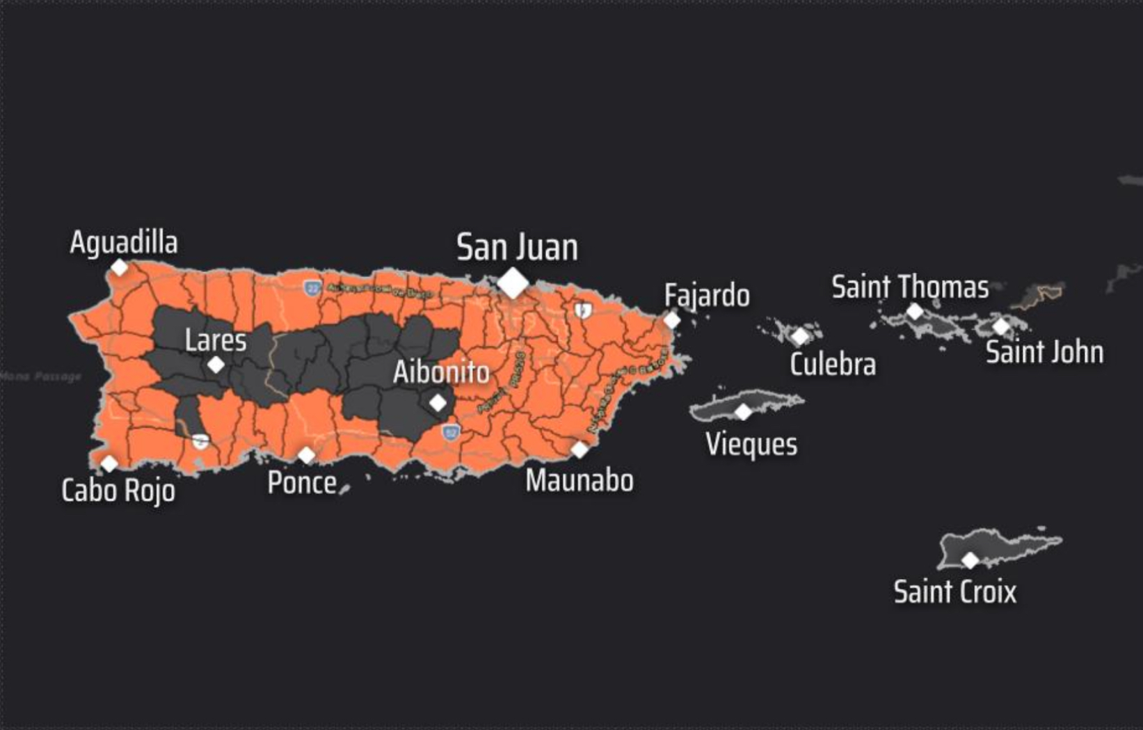El mapa publicado por el SNM muestra en color anaranjado las zonas bajo advertencia, que incluyen municipios del norte, sur, este y oeste de la isla.