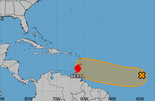 Continúan los aguaceros y tormentas asociadas con un área de baja presión ubicada a más de 1000 millas al este-sureste de las Islas de Barlovento.
