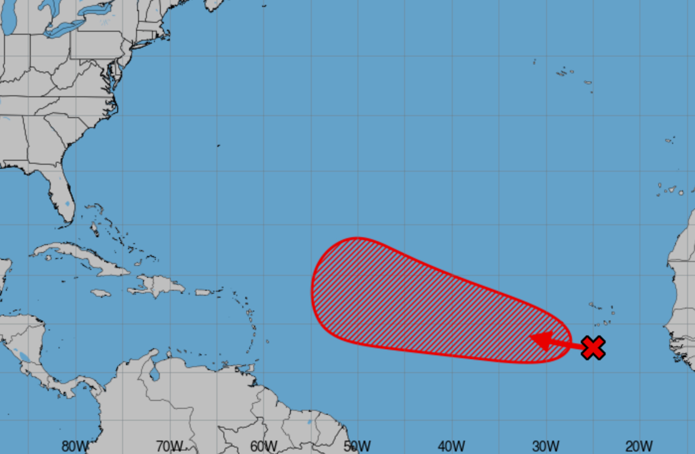 El sistema genera aguaceros y tronadas desorganizadas mientras se desplaza hacia el oeste-noroeste a unas 15 millas por hora a través del Atlántico tropical.