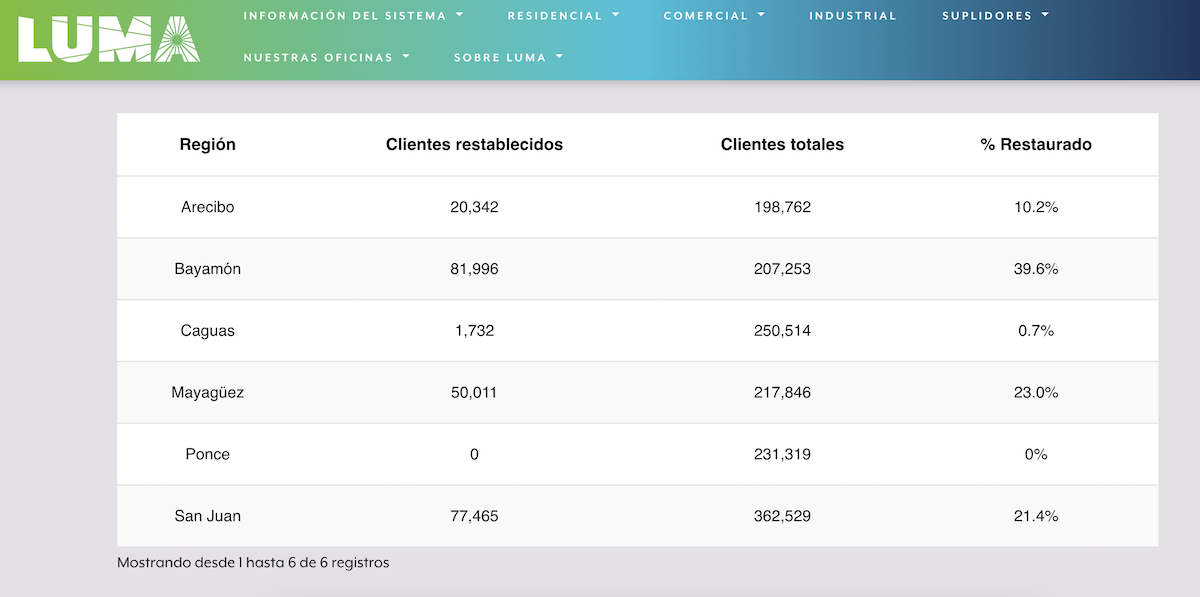 Esto contrasta con la Región de Bayamón donde 81,996 clientes (39.6 por ciento) ya tenían servicio. En la Región de San Juan, a otros 77,465 (21.4 por ciento) se les había restablecido el servicio.