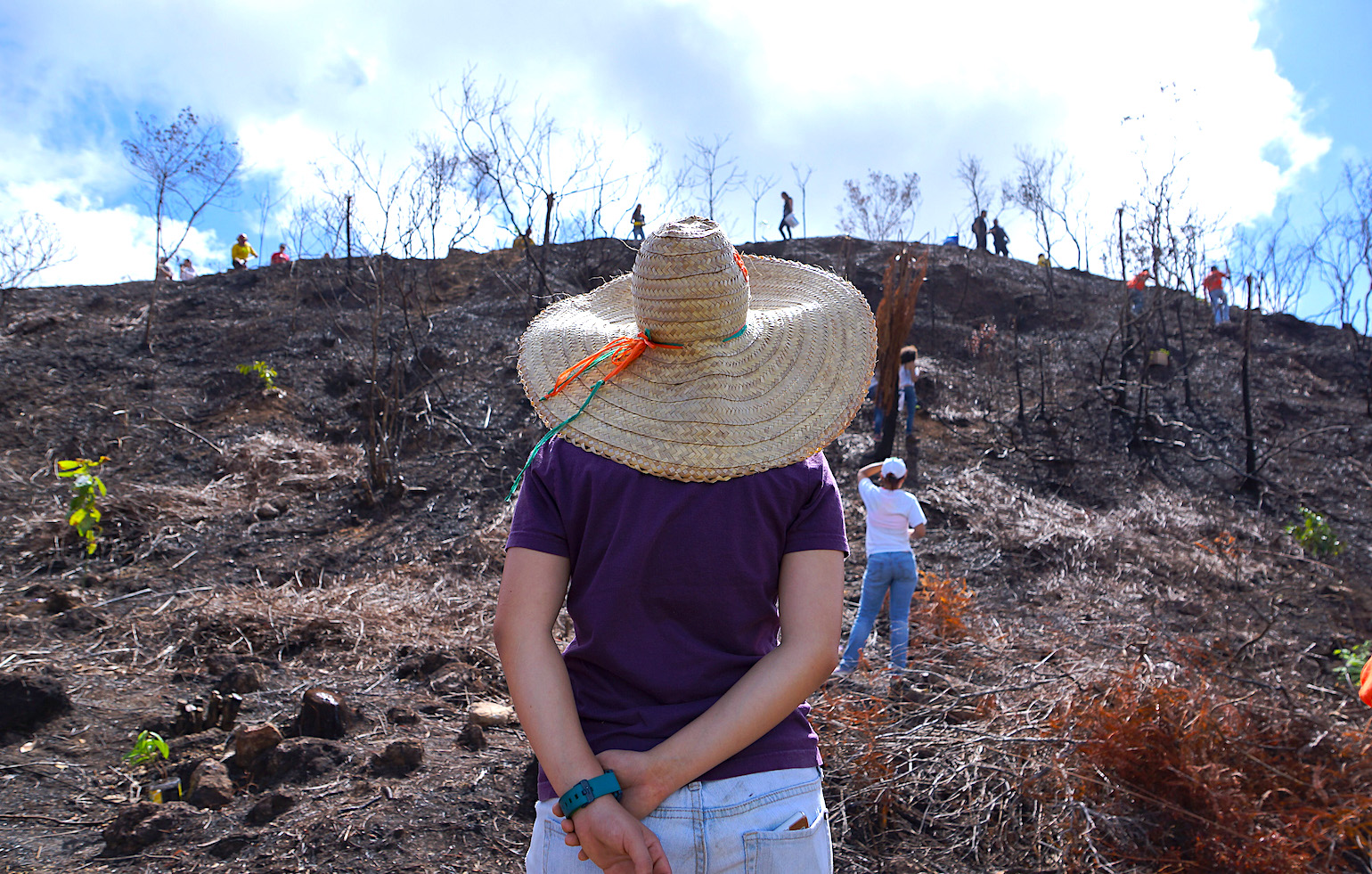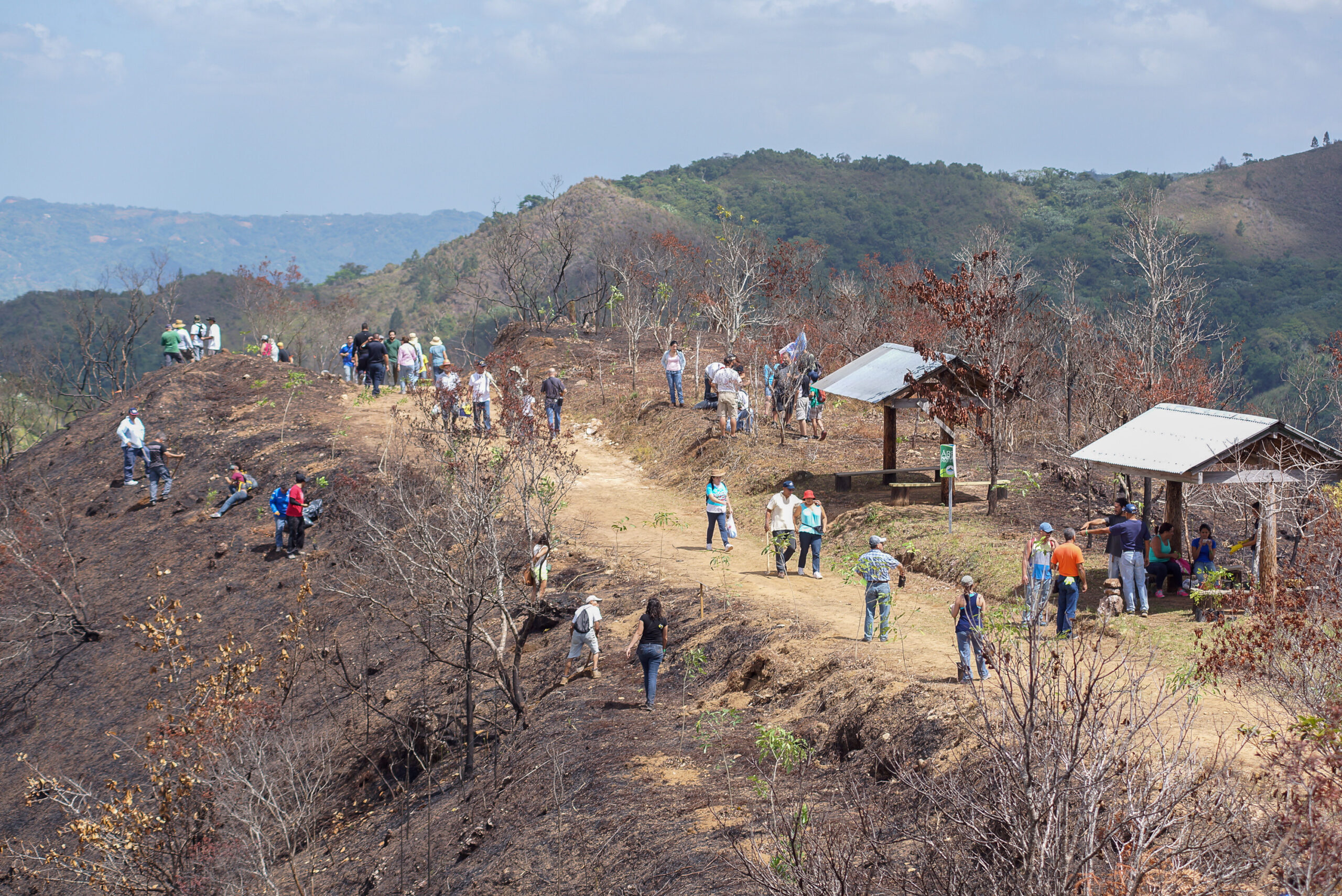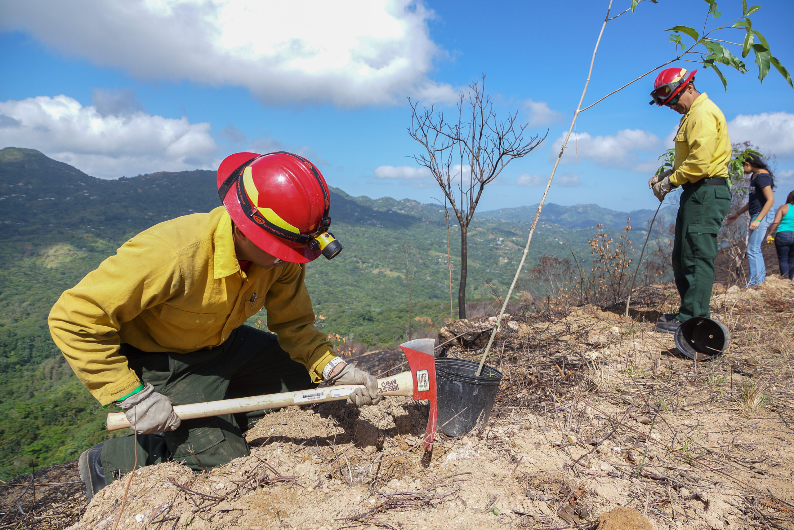 Con picos, palas y machetes sobre sus hombros, medio millar de personas acondicionaron el terreno para sembrar cerca de 800 árboles nativos y frutales sobre varias de las pendientes arrasadas, un ejercicio de solidaridad que contó además con la participación de los mismos bomberos que extinguieron el incendio, además de artistas como Antonio Martorell, el guitarrista Josean López y el cantante José Nogueras.