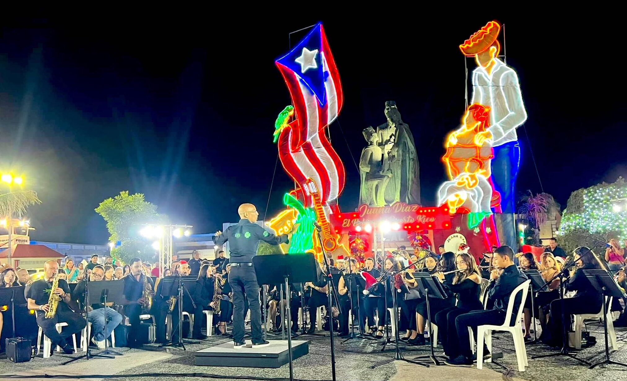 La plaza pública Román Baldorioty de Castro de Juana Díaz no deja de recibir visitantes de día ni de noche pues, aparte de la llamativa decoración navideña que la engalana, los espectáculos artísticos diarios convocan a personas de toda la isla.
