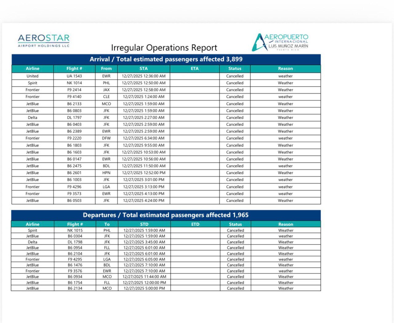 Se cancelaron 30 vuelos en total en el Aeropuerto Internacional Luis Muñoz Marín. Diecinueve vuelos de llegada y once vuelos de salida.